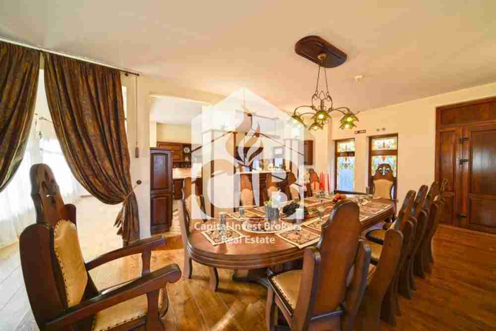 В дворното място е разположен отопляем басейн и закрит гараж за три коли.